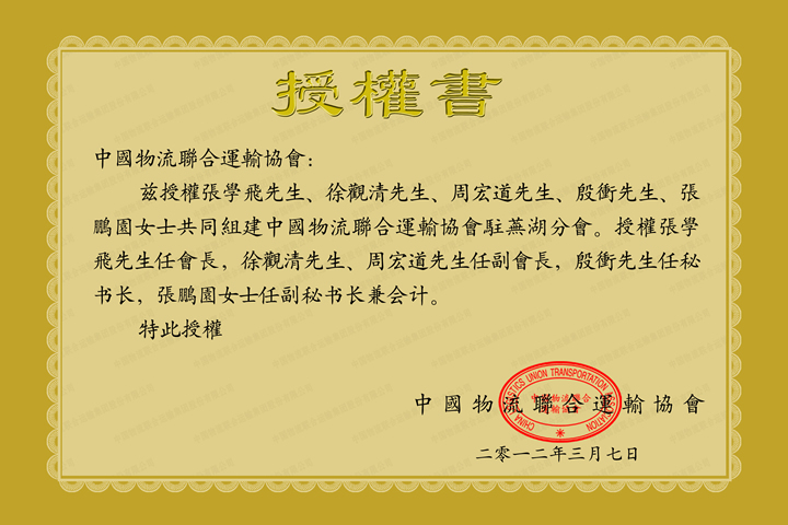 中国物流联合运输协会芜湖分会授权书